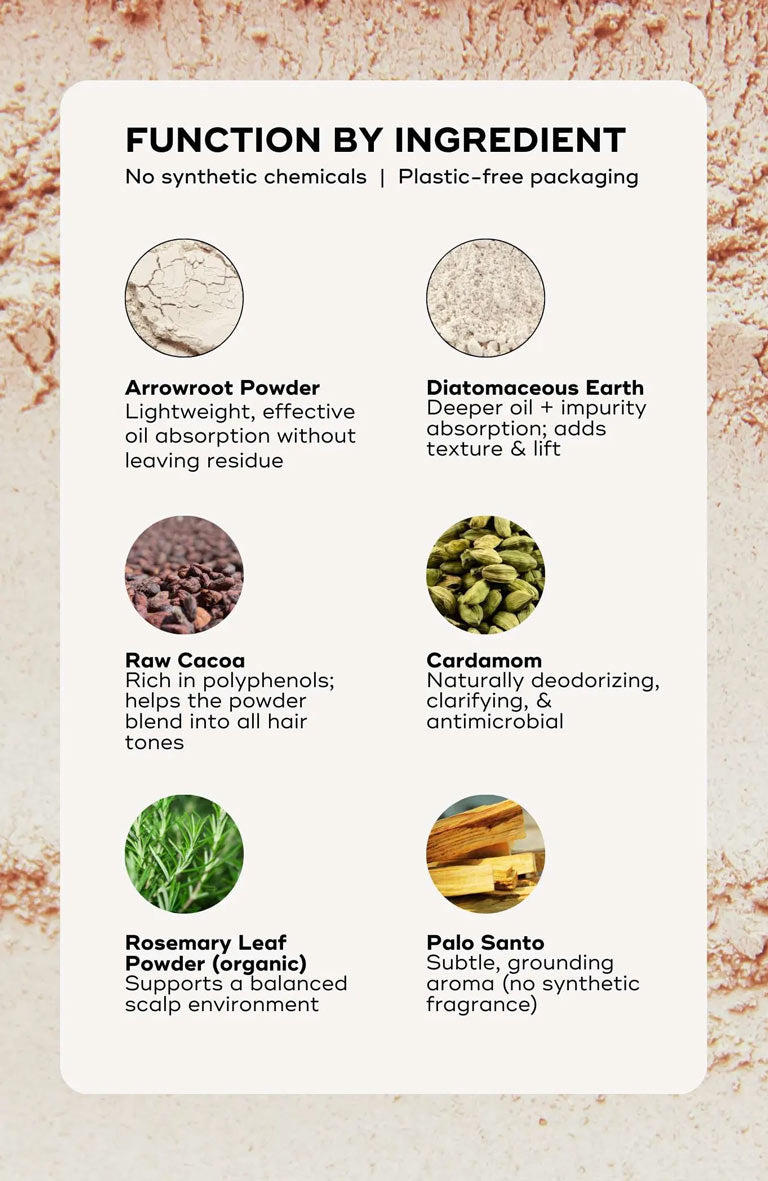Most dry shampoos rely on aerosols, synthetic fillers, and disposable packaging that burden your body and the planet. Ours takes the opposite approach: fewer ingredients, smarter materials, and practices that help restore rather than deplete.