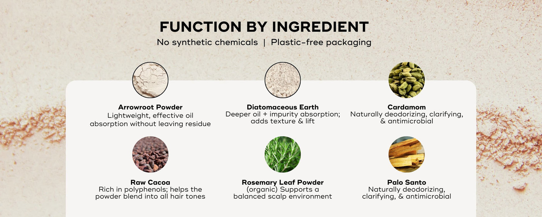 Arrowroot Powder, Diatomaceous Earth, Cardamom, Raw Cacao, *Rosemary Leaf, Palo Santo Essential Oil (*Certified organic